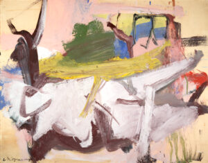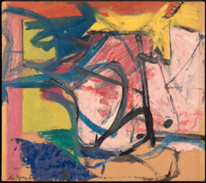De Kooning's later period focused mainly on abstracted landscapes. In the 1980s, in failing health, he developed an entirely different abstract style, using primary colors and open, ribbonlike forms.