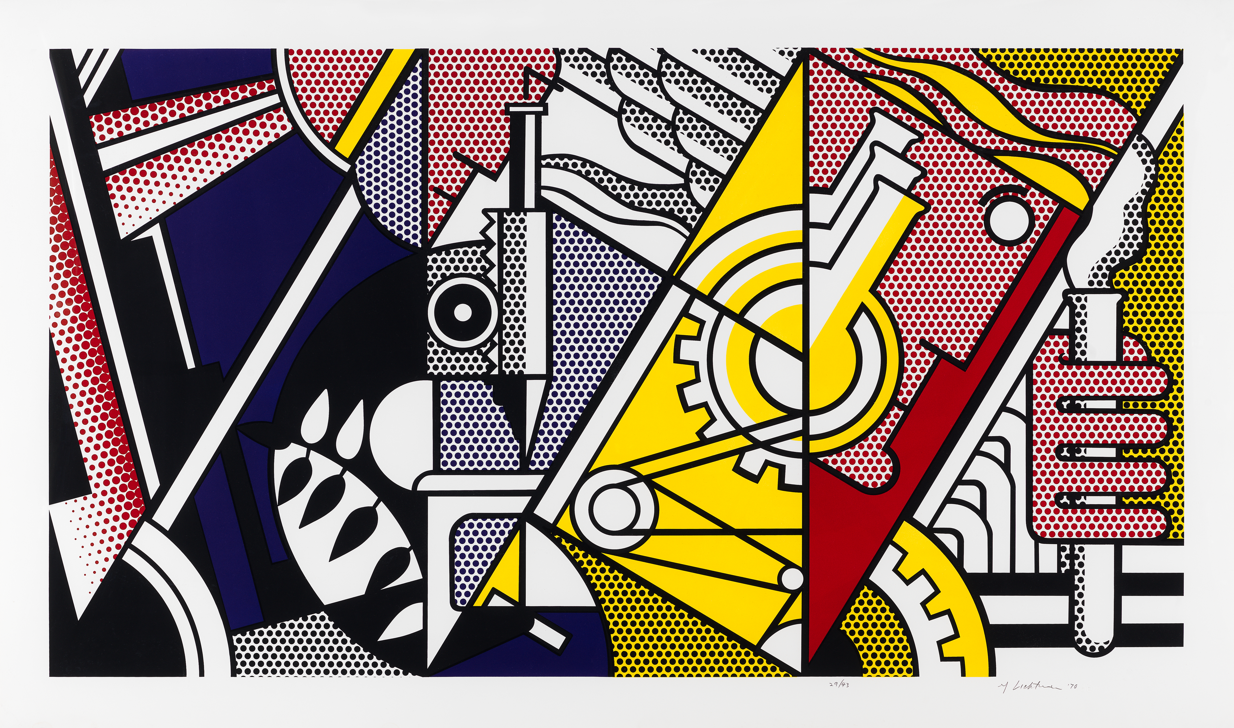 Although trained as an abstract painter, Roy Lichtenstein became a pioneer of Pop art famed for paintings based on generic romance books and war comics. Lichtenstein transferred the clichéd comic-book compositions to canvas with a projector and simplified them; the resulting paintings mimic the impersonal appearance of cheap four-color printing, despite being meticulously handmade. Characteristic of this work are the enlarged benday dots that would become Lichtenstein's signature mark.