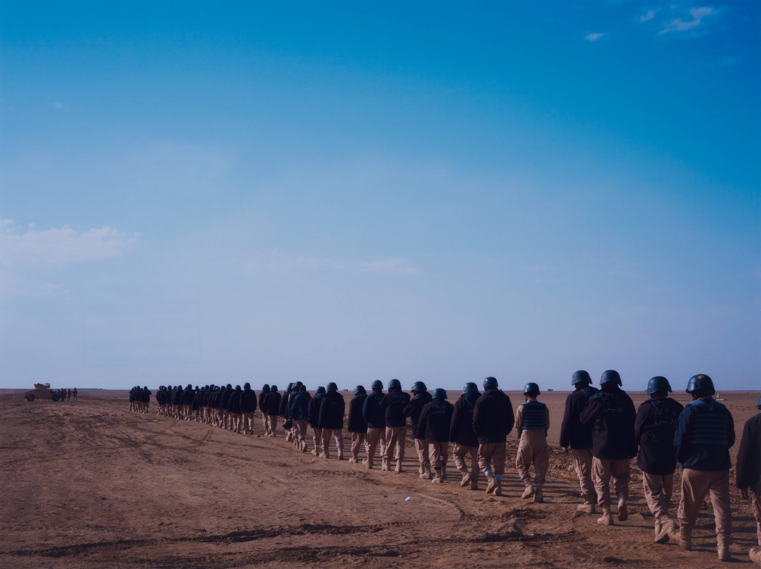 - Afghan police trainees being taken to the firing ranges by US Marines, Camp Leatherneck, Helmand, from the portfolio Burke + Norfolk: Photographs from the War in Afghanistan by John Burke and Simon Norfolk