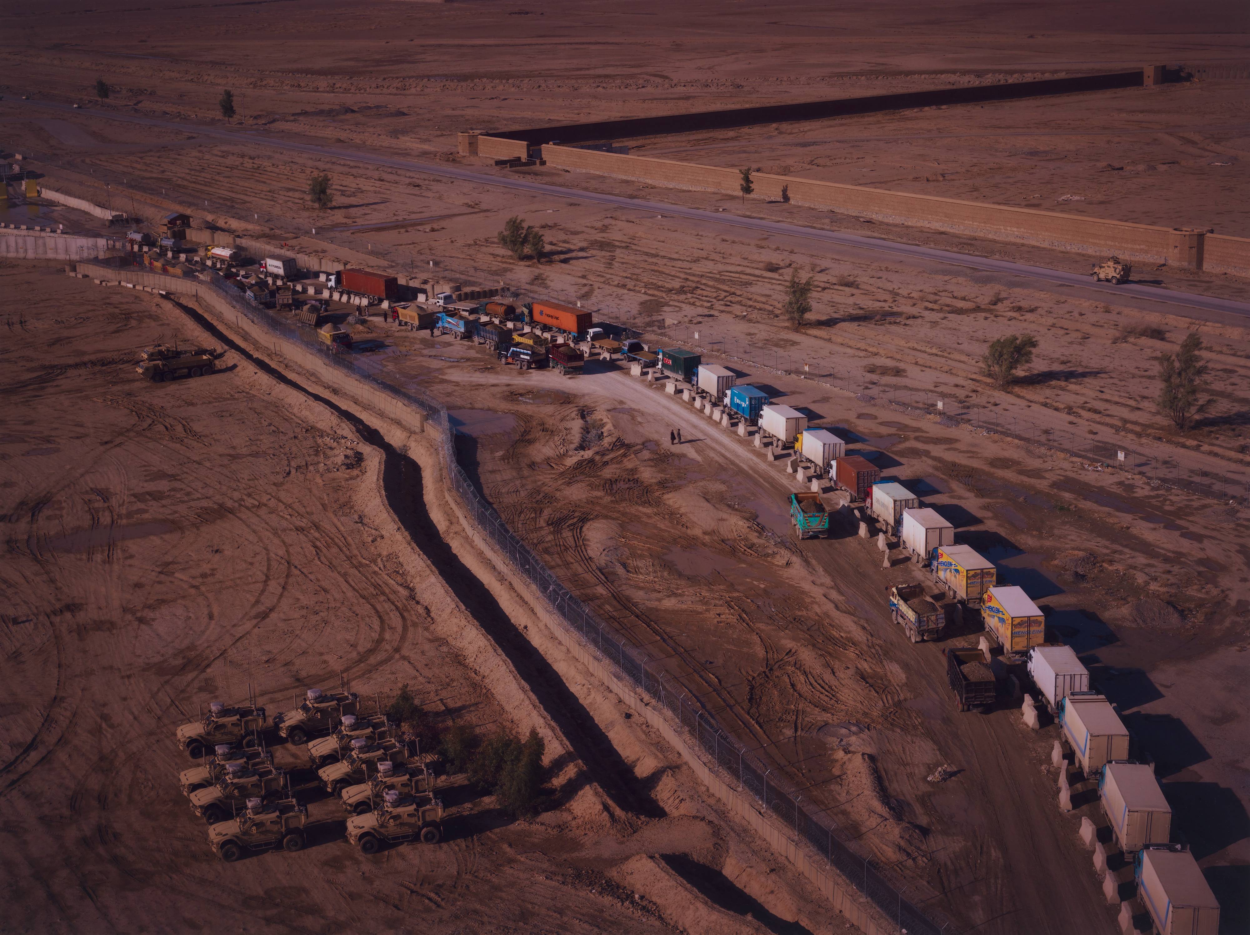 - Pakistani 'jingle trucks' end their long journey up from Karachi at the gates of Kandahar Airfield where they wait to be scanned, X-rayed and searched, from the portfolio Burke + Norfolk: Photographs from the War in Afghanistan by John Burke and Simon...