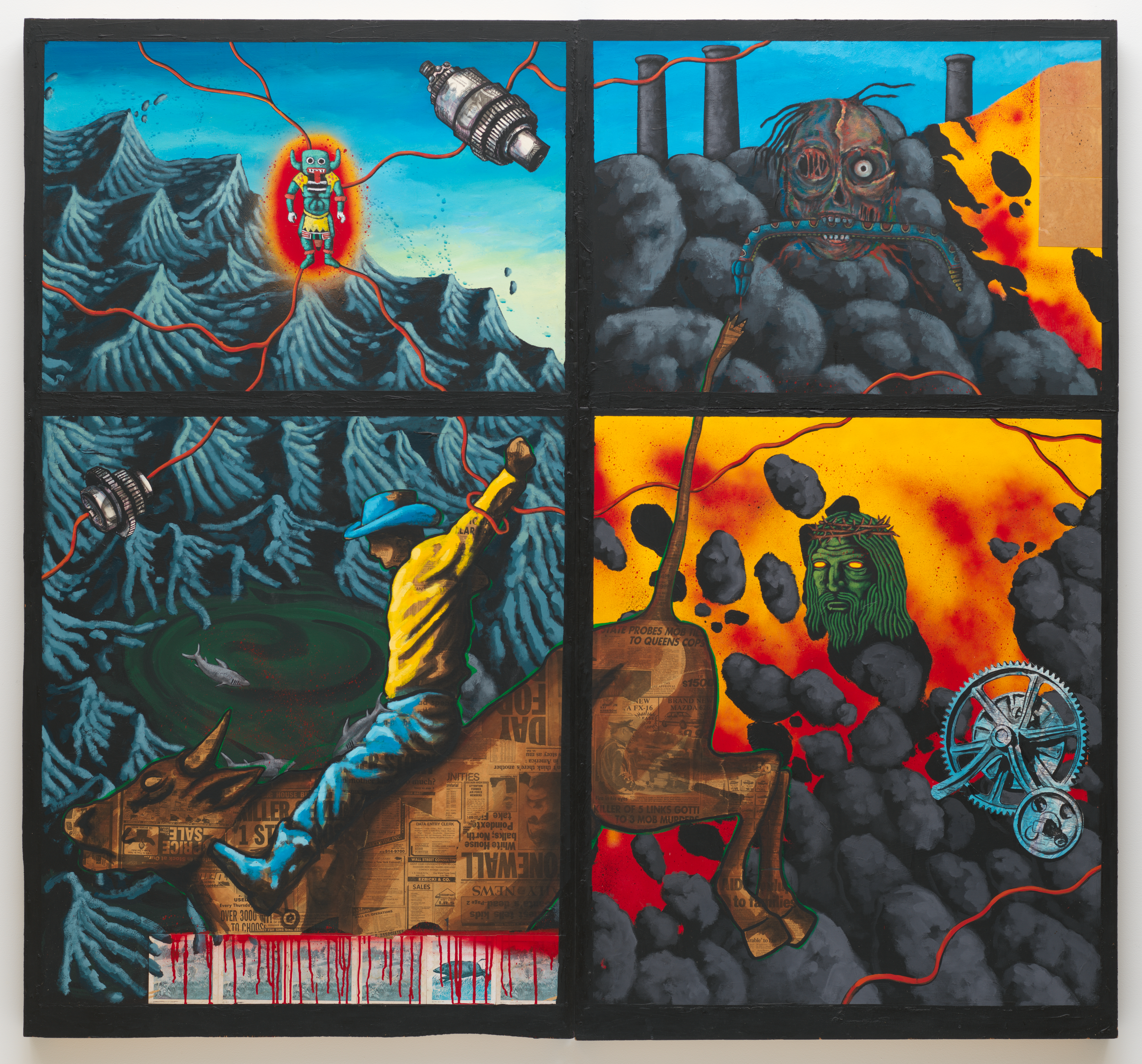 - spray paint, acrylic, and collage on plywood