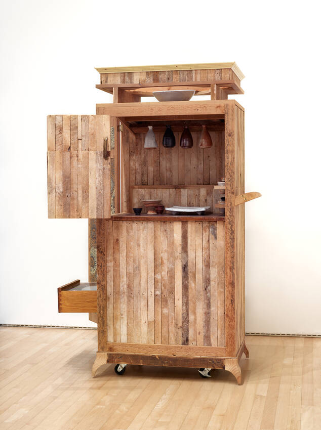 - Lath, oak, brass, cedar, stoneware and glazes