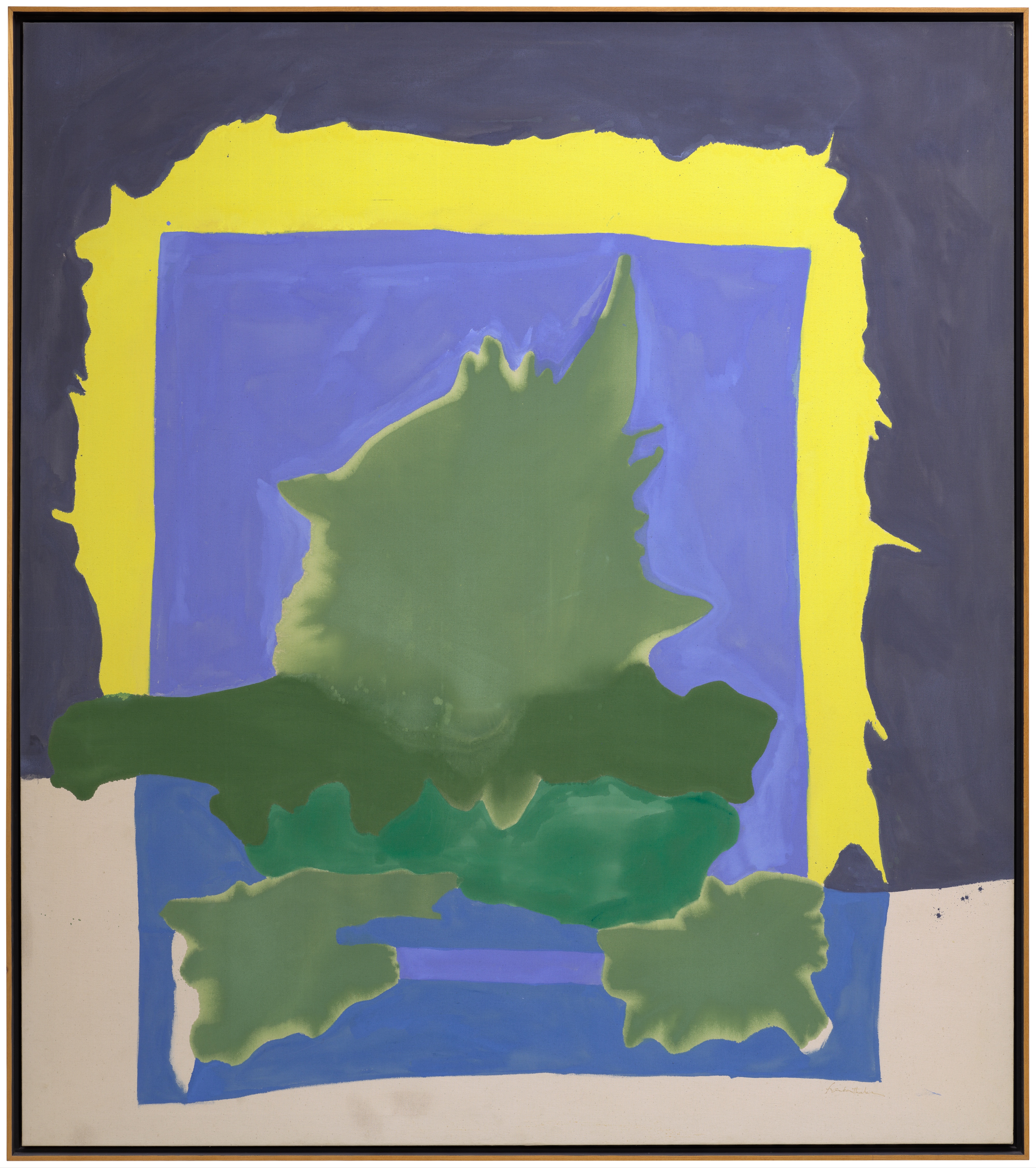 A bright yellow form creates a second frame within Interior Landscape. The artist acknowledged that its spiky contours, produced by the original splash of paint, are atypical in her work, whereas the staining and saturated color that wrap around the edges of the canvas are considered her hallmarks. Many of her titles make reference to nature, but Frankenthaler never drew subjects directly from the landscape, instead favoring explorations of abstraction.