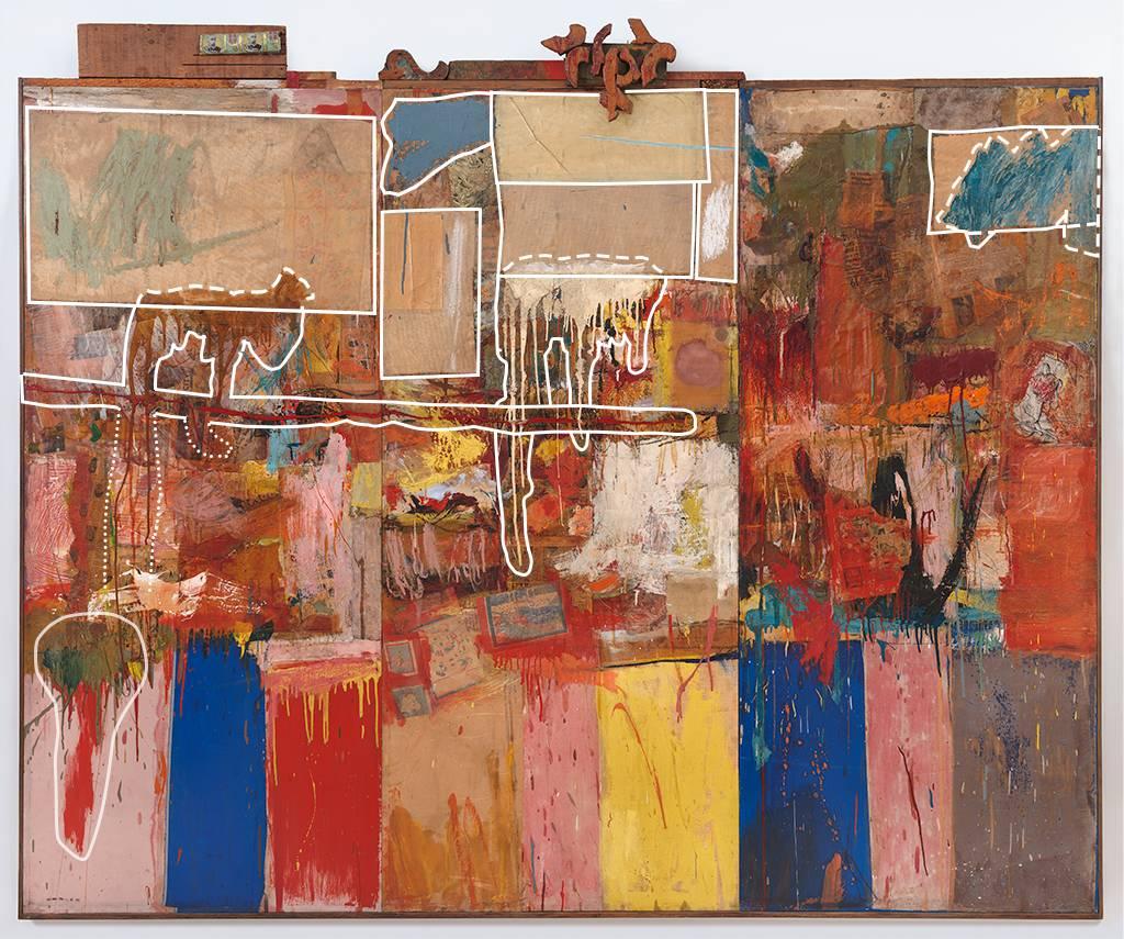 The white highlighting in this image outlines additions Rauschenberg made to Collection (then untitled) following the close of Bob Rauschenberg at Charles Egan Gallery, New York (December 1954–January 1955), the first exhibition in which the work appeared. Rauschenberg’s alterations included the addition of layers of fabric and patches of paint across the top, the application of a white swipe of paint that is now the focal point of the center panel, and the addition of a thick squeeze of red paint that crosses the two leftmost panels. This drippy swipe and fat line of paint would become signature elements of Rauschenberg’s Combines, a body of work he created between 1953 and 1964 that bridges painting and sculpture.