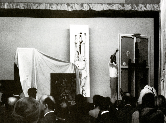 By the early 1960s Rauschenberg had moved from Automobile Tire Print as register of performance to actual staged performance work.11 In Homage to David Tudor (1961) he collaborated with Tudor (1926–1996), Jasper Johns (b. 1930), Niki de Saint Phalle (1930–2002), and Jean Tinguely (1925–1991) on a performance at the Théâtre de l’Ambassade des États-Unis in Paris. Tudor performed Cage’s composition Variations II (1961); Johns crafted a target out of flowers; de Saint Phalle included one of her tir, or “picture-shoot,” paintings; and Tinguely contributed a motorized sculpture. As his contribution to the performance, Rauschenberg created First Time Painting (1961). He worked onstage with the back of the canvas facing the audience, leaving them unable to see the work (fig. 4). When an alarm clock attached to the canvas rang, Rauschenberg ceased to paint and the canvas was wrapped in paper and taken offstage.12 Rather than see the work as it was made, the audience experienced its making aurally; contact microphones amplified the sound of Rauschenberg crafting the painting. There is thus an explicit temporal element to the work, insomuch as it was completed within an established duration, in addition to the sonic aspect of its performance. The latter, in particular, points to Cage; one becomes attuned to the sounds of making First Time Painting and, by extension, to the sounds of one’s surroundings—the sounds of painting and living.