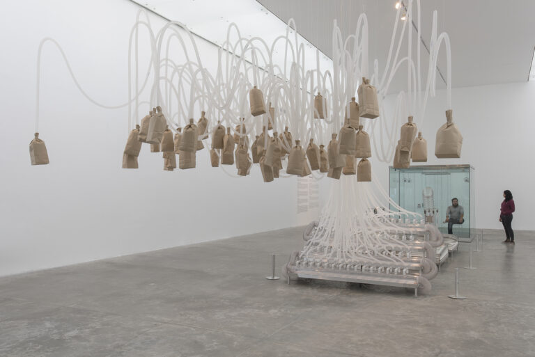 Vicious Circular Breathing (2013) is a large sculptural installation featuring brown paper bags that inflate and deflate at human breathing rates; a set of motorized bellows and valves that control the bags; and a sealed glass room with a decompression chamber. Visitors are invited to enter the glass room to breathe the air that was previously breathed by earlier participants. The piece includes warnings about the risks of asphyxiation, contagion and panic, offering a statement on the limits of the planet’s resources as well as a commentary on participation, which in this case makes the air more toxic for future visitors.