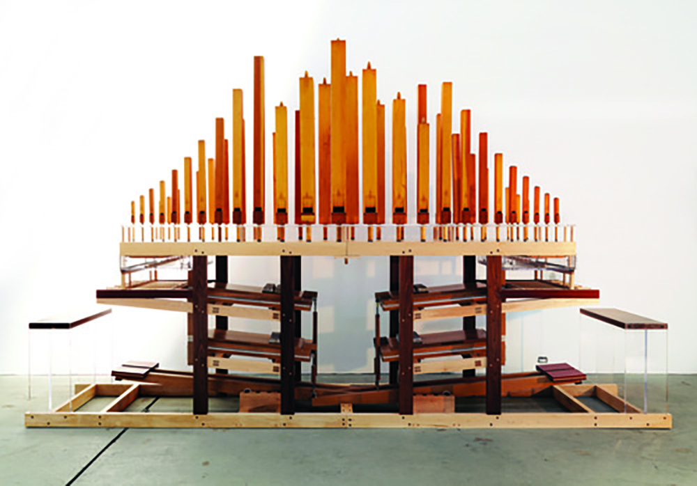 The Auerglass Organ is a two-person collaborative pump organ created by Tauba Auerbach and the musician Cameron Mesirow (also known as Glasser). The Auerglass will be performed throughout the run of the exhibition.
