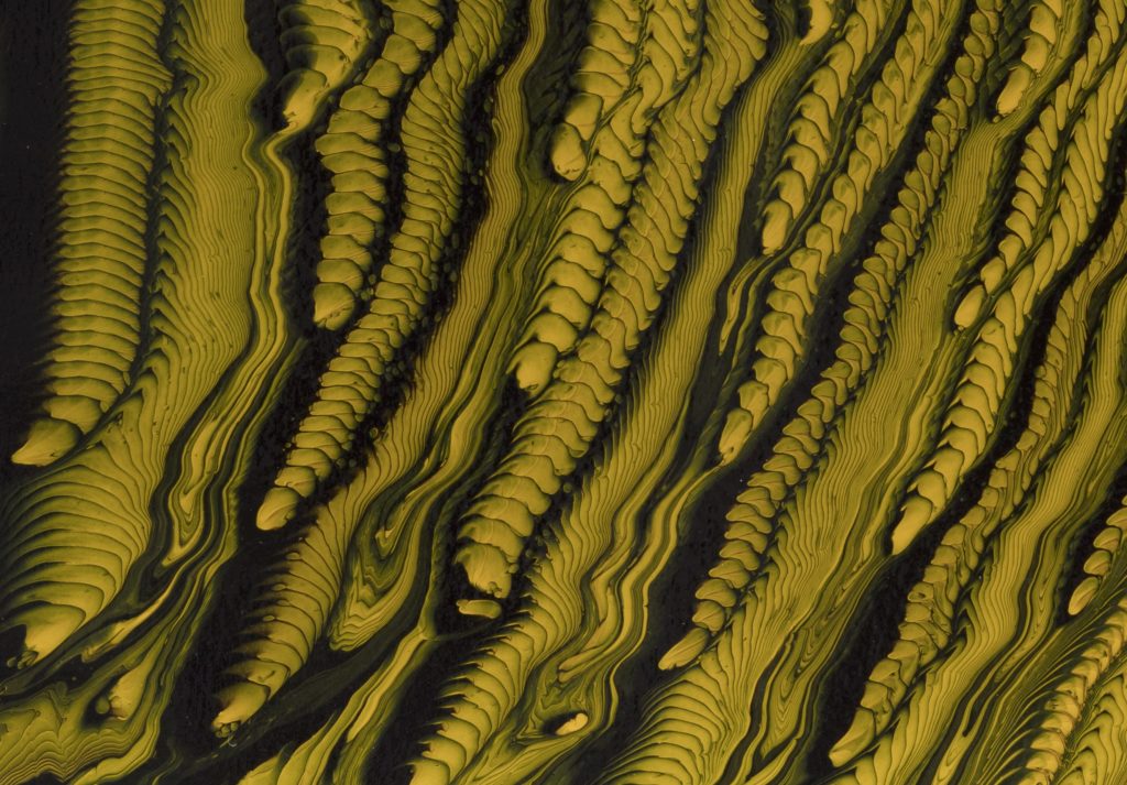 The Grain paintings are created with custom-made tools that Auerbach drags through layers of color, resulting in canvases that are embedded with ornamental and fractal forms read through the physicality of gesture.