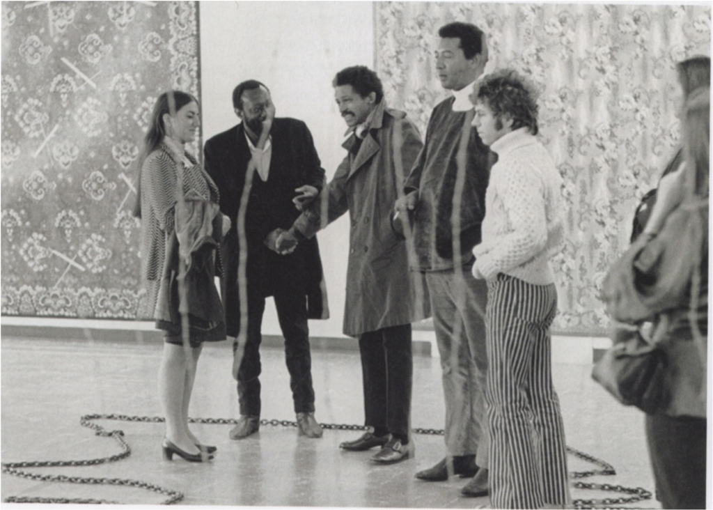 Frank Bowling, Jack Whitten, Al Loving, and friends at the opening of 5+1 at the State University of New York at Stony Brook, New York, 1969; photo: Adger Cowans; © Adger Cowans; courtesy Frank Bowling Archive