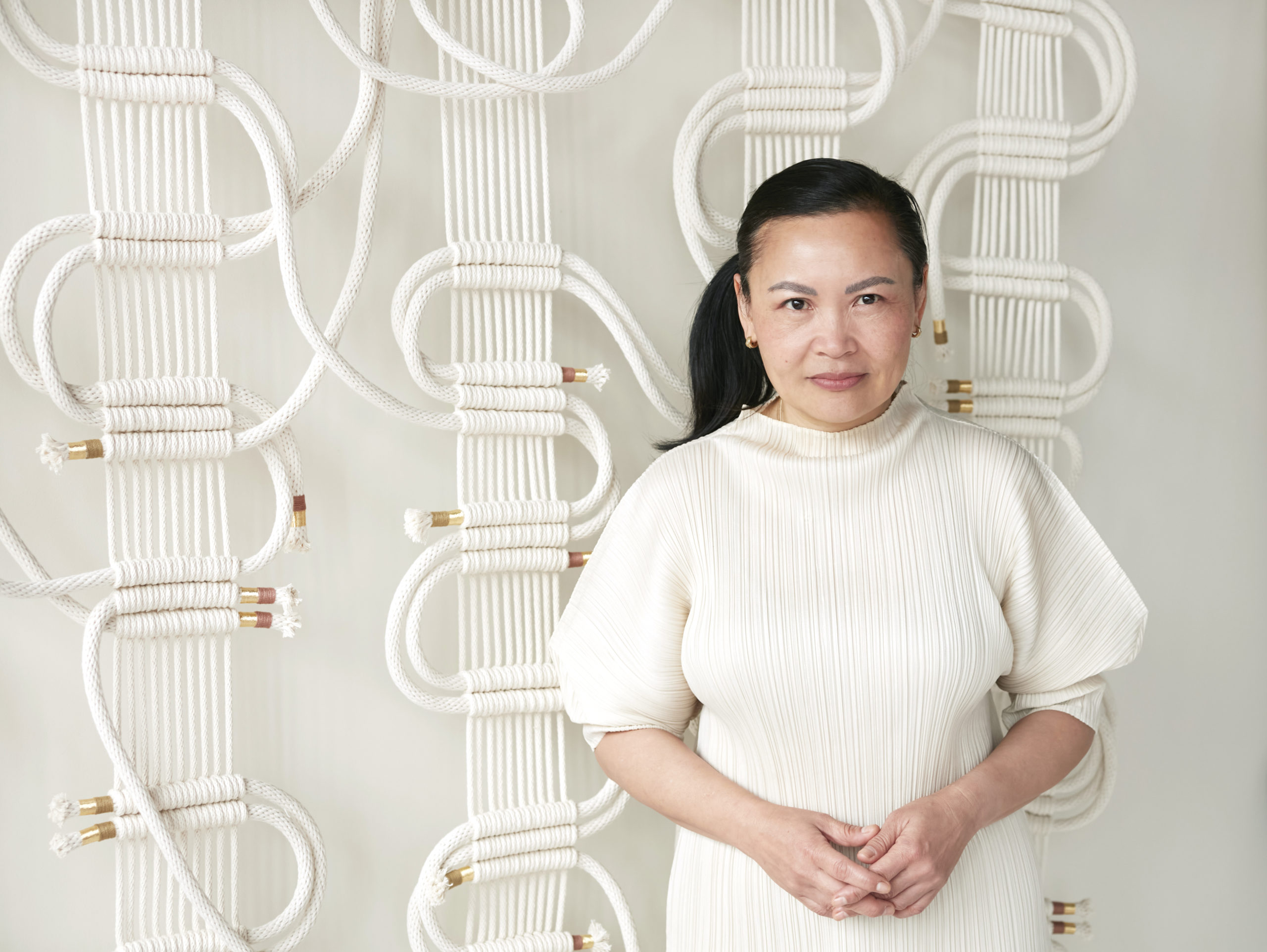 She called in Marcus Guillard of One Hat One Hand, an interdisciplinary design studio in San Francisco. “The unsung heroes of the art community are fabricators and art handlers,” says Chien. “Art handlers have so much knowledge, and I respect how they know their shit. Fiber art is in both the worlds of fine art and craft, so I’ve learned a lot about how the world views both. There’s an assumed hierarchy placing art above craft. Craft has a profound understanding and respect for the materials, and that informs the art.”