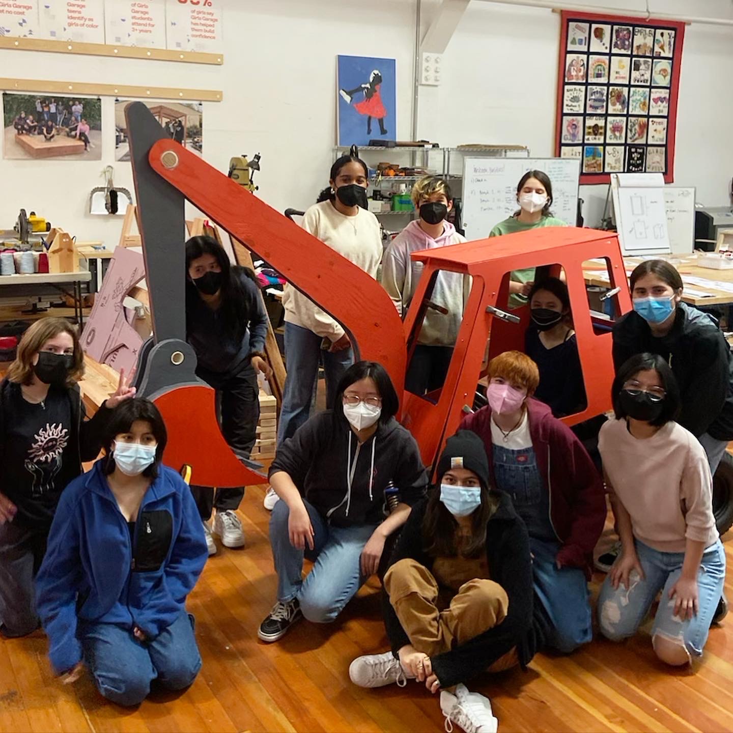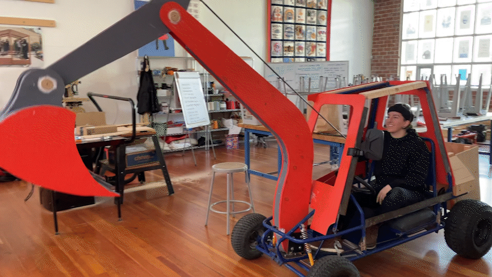 “Big machinery is typically associated with men and masculinity, but we wanted to challenge that. We thought about the iconic imagery for women at work, so we chose an excavator, with the big claw for moving earth, for manipulating the environs,” Pilloton-Lam says. “We are modifying a go-kart frame we got second-hand online. We’ve learned a lot about car parts, and the process of building it has been super fun. Every week we get together to divide and conquer; welding and modifying the metal of the frame, then sheathing it in wood.”