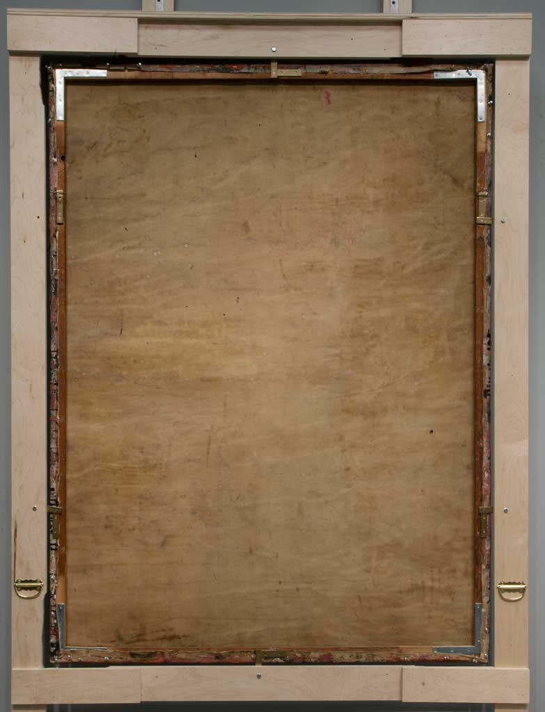 Rauschenberg’s Untitled [glossy black painting] is shown here in a conservation handling frame built to facilitate the 2012 replacement of the honeycomb insert on the back of the work. This photo depicts the painting during treatment, without the insert. When secured to the wall in the handling frame, the canvas can be safely accessed from behind while the surface of the work remains elevated from the wall. The frame makes use of existing hardware on the back of the work that is usually used to fasten it into a travel frame or crate for transportation or storage.