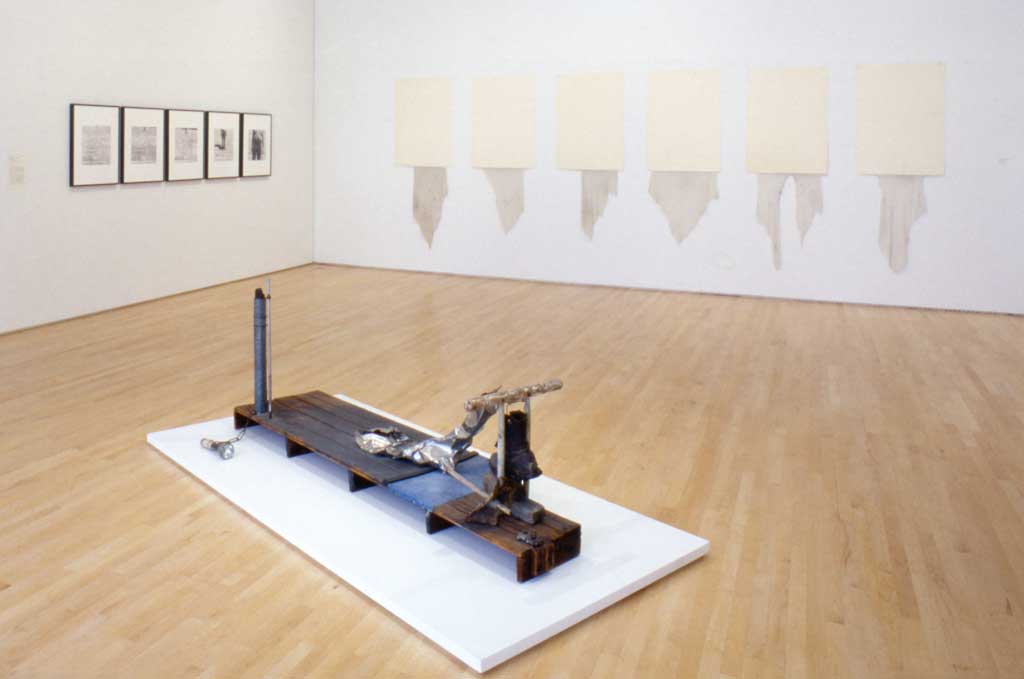Installation view of Robert Rauschenberg’s Pyramid Series (1974) in the SFMOMA collection presentation Matisse and Beyond, 2004. Rauschenberg’s Trophy IV (for John Cage) (1961) appears in the foreground. Cy + Roman Steps (I–V) (1952) is on the wall at left.