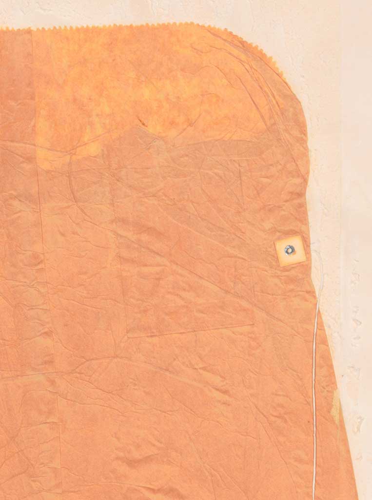 Untitled (1973) is one of many works by Rauschenberg to include quotidian materials such as envelopes and other paper products. This detail shows a small string closure—detached from an office envelope to be used as part of this composition—pressed onto a flattened paper bag. Rauschenberg’s process included folding the partially finished work in half and running it through a press. This resulted in mirror-image imprints of the collaged elements that were revealed when the work was unfolded. Here, the embossed silhouette just to the left of the tie closure records the impression of a small envelope that is affixed to the opposite edge of the artwork.