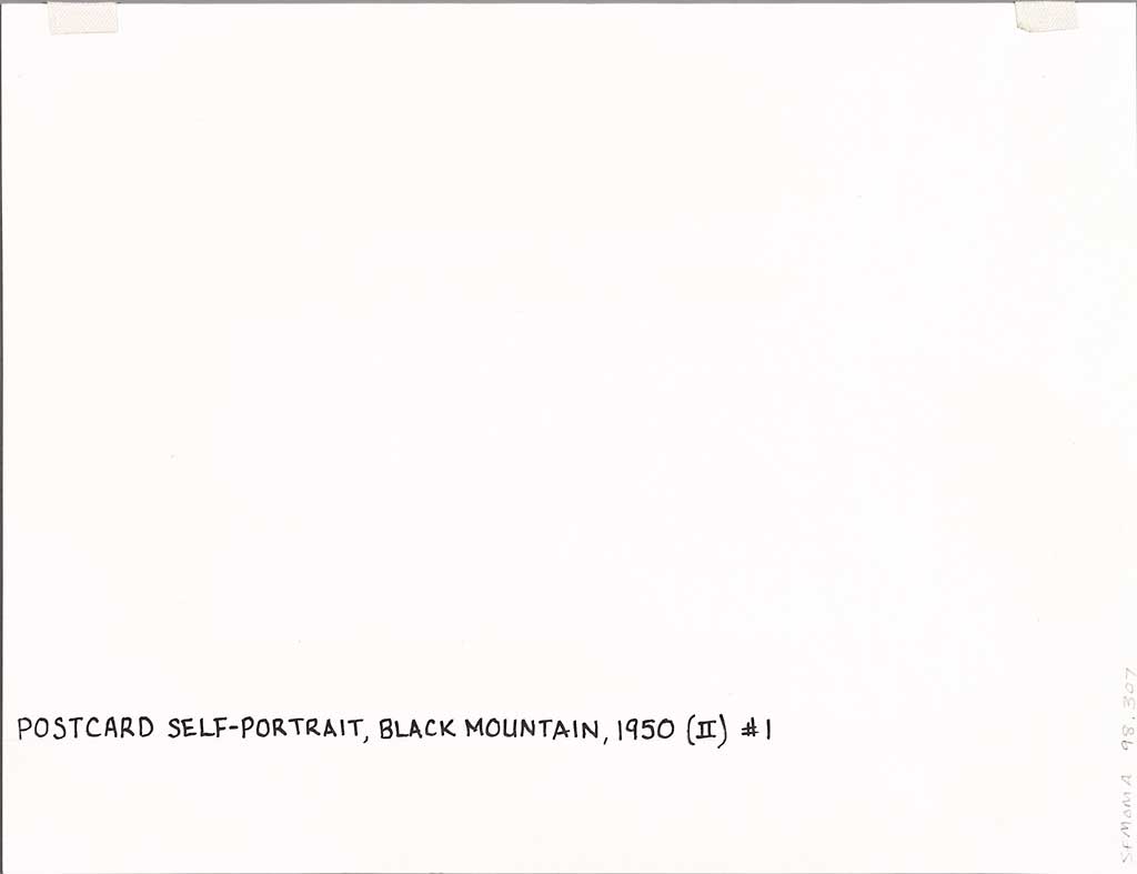 Postcard Self-Portrait, Black Mountain (II) was printed by Rauschenberg both as an individual photograph and as part of an editioned portfolio of seven related photographs, all of which were taken during the summer of 1952 at Black Mountain College near Asheville, North Carolina. This view of the back of SFMOMA’s photograph shows the inscription, which indicates that the print is number one of three known to have been issued independently of the portfolio edition. The roman numeral II in the artwork’s title distinguishes it from another self-portrait in the portfolio—a double exposure showing Rauschenberg sitting in a chair with the crown of a tree overlapping his upper body.